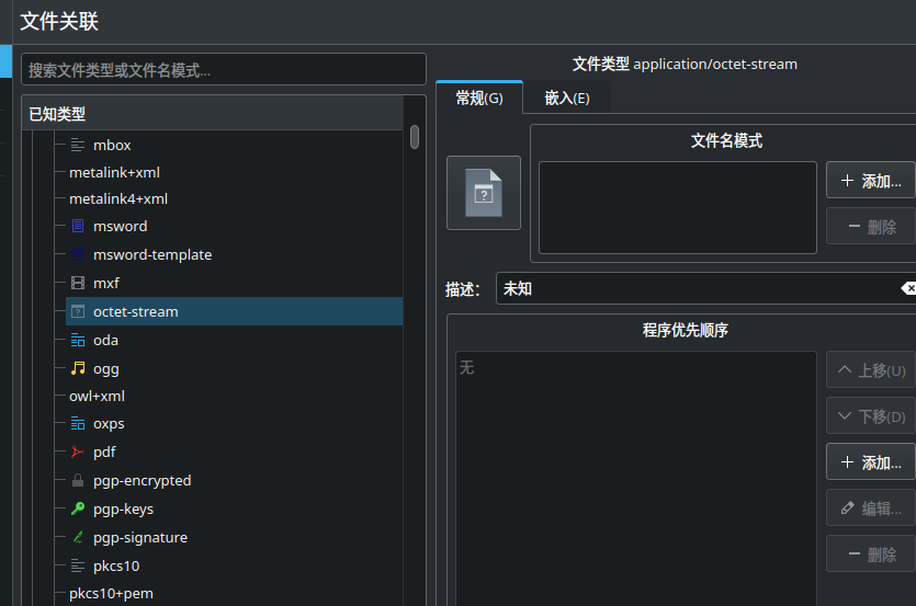 然后找到系统设置,找到应用程序,找到文件关联,找到 application/octet-stream,