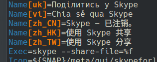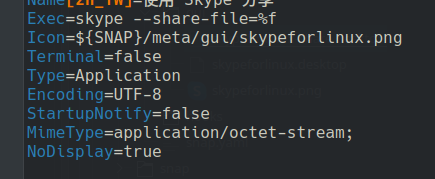 找到 skypeforlinux-share.desktop 文件,我的 Skype 用 Snap 安装的,所以在 /snap/skype/263/meta/gui/skypeforlinux-share.desktop 这里,当然 263 可能是版本号之类的,不过什么版本的都无所谓,设置是一样的,主要是打开这个文件,看到里面的 MimeType 是 application/octet-stream。